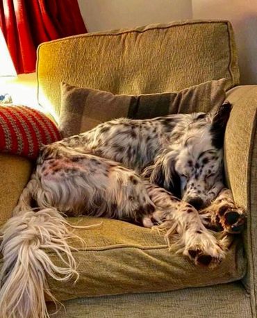Theo is now a much loved member of a wonderful family who adore him and he has managed to curl up in his Dad’s favourite chair already.